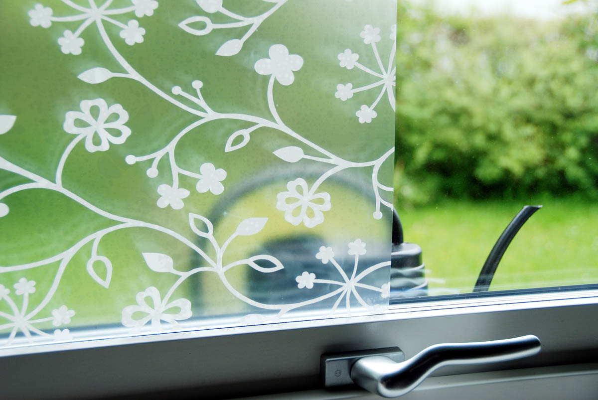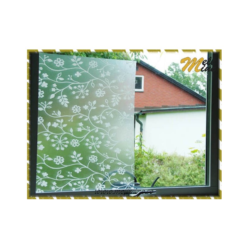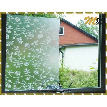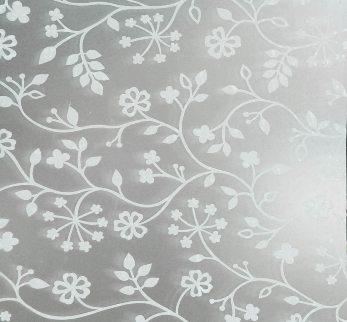 Fönsterfilmen är färglös (frostad) med vita rankor/ blommor. Slät framsida.