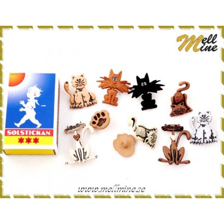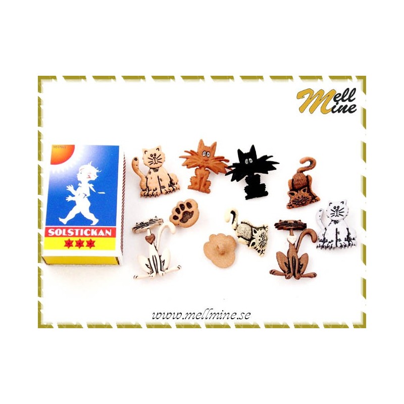Dekorationer till allt som har med katter att göra. Alla är knappar. Förpackningen innehåller: 8 katter i olika färger och storlekar 2 tassar Öglan på baksidan av knappen kan knipsas av med en tång. Dekorationerna är gjorda i plast.