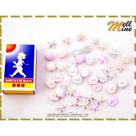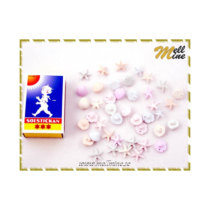 Dekorationer i ljusa pastellfärger som passar till allt inom hav, vatten, bad med mera. Alla är knappar. Förpackningen innehåller cirka: 20 sjöstjärnor i olika färger 12 snäckor i olika färger 10 blommor Öglan på baksidan av knappen kan knipsas av med en tång. Dekorationerna är gjorda i plast.
